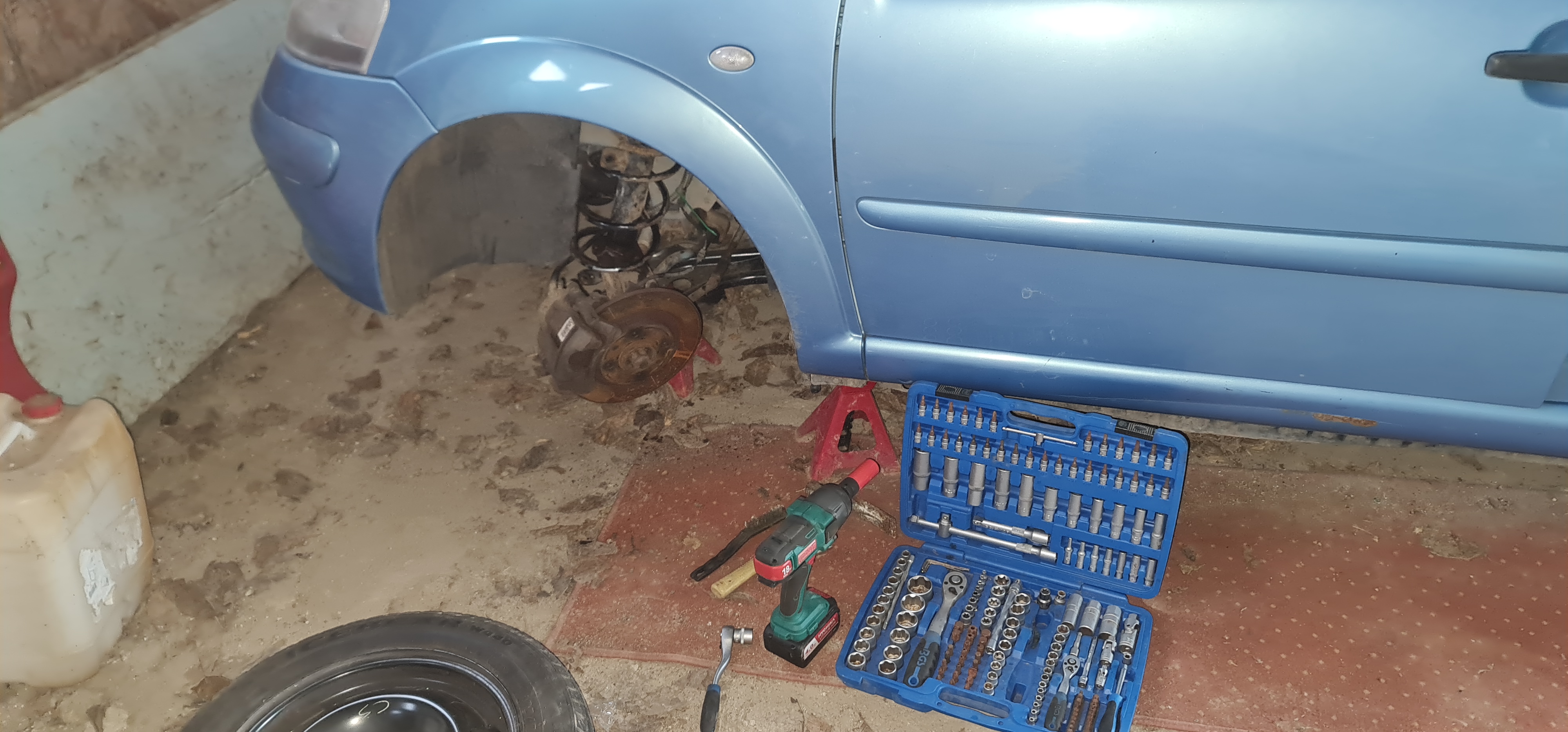 Akkor itt vannak az ígért képek az autószerelésről. Tehát a Citroen ablakát azért kellett betörnöm mert a zár nem volt jó az akksi pedig lemerült. Így kinyitni se tudtam a motorháztetőt, hogy feltöltsem. Szóval ez olcsó volt a bontóban, alig 5000 forint ennyiért nem jött volna ki egy zárszerelő kinyitni a kocsit. Az üveget természetesen én magam szereltem be. A nehezebb ügy az eltört rugó volt. Ehhez speciális rugóösszehúzó célszerszám kell ami nekem természetesen van, de a bontóban azt mondták jobb ha az egész gólyalábat cserélem ki a teleszkóppal együtt. Így nem kell a rugót is kiszedni. A teleszkóp kiszedéséhez viszont ettől függetlenül azért az egész futóművet le kell választani róla és 20 éve meghúzott csavarokkal ez nem egyszerű. De sikerült a Doki közvetlen aszisztenciájával :) Így tehát a kocsi kész. Teljesen működőképes és így be is tudtam adni egy kereskedésbe. Előtte persze lemostam és kiporszívóztam. Megveszik hamar szerintetek?